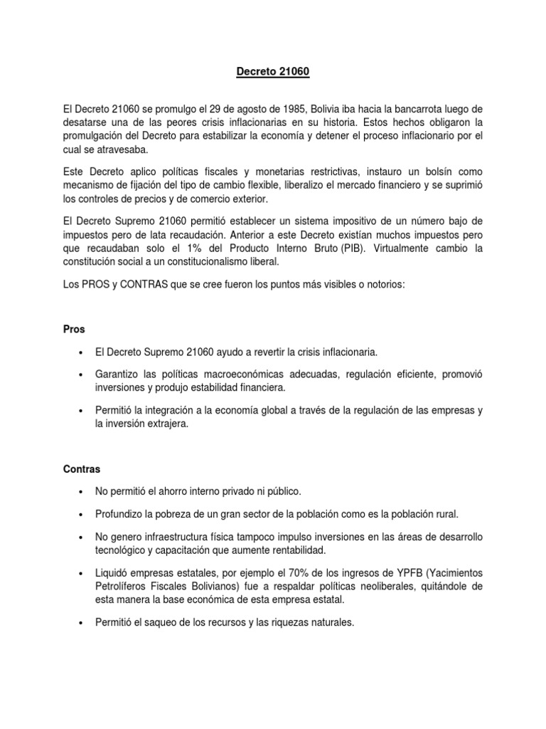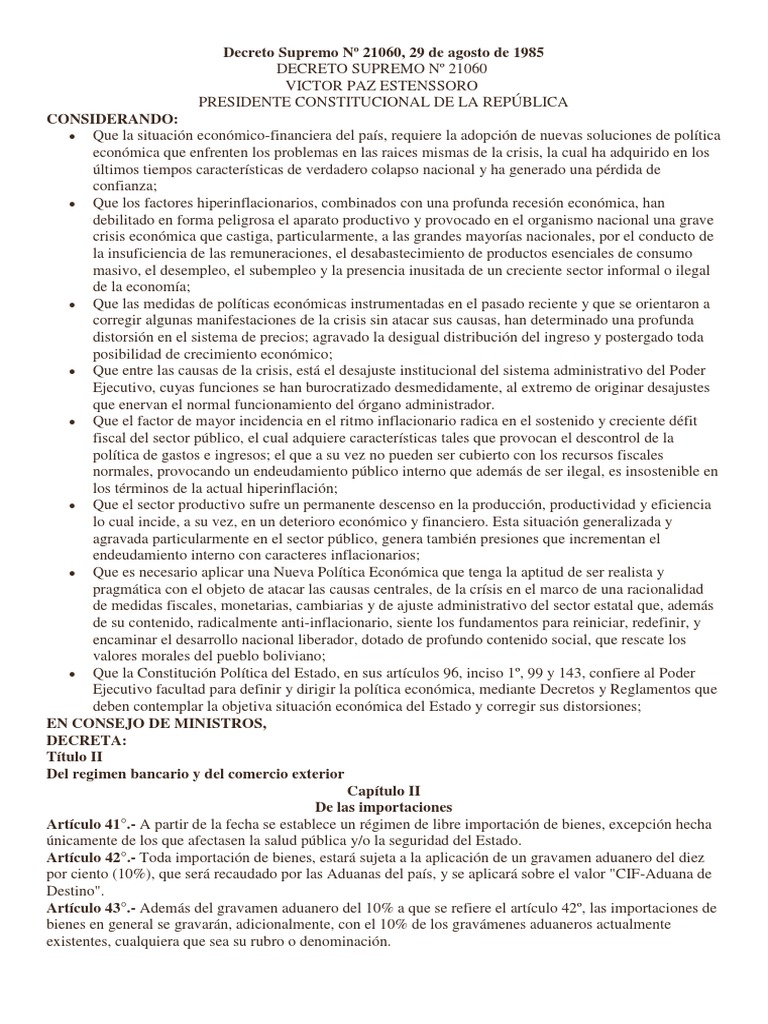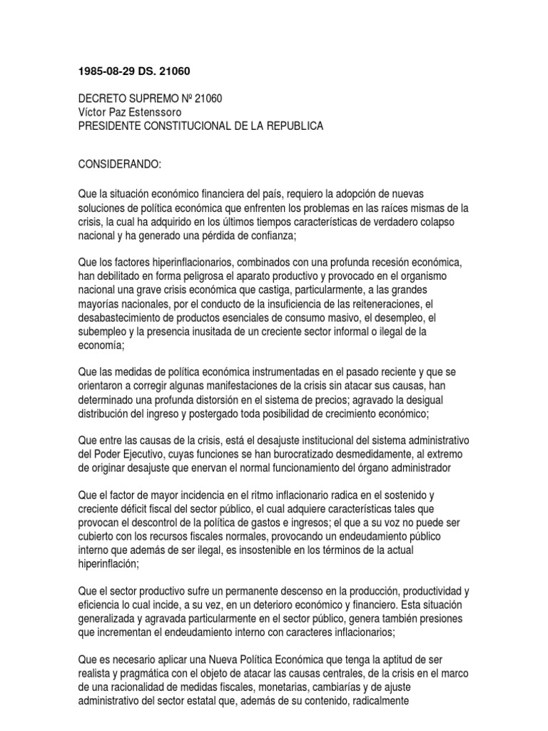 Set into motion by the decreto supremo , the policies helped the bolivian government delay loan 1 decreto supremo , 29 august the presidential decree , the key. La reapertura de créditos al país, la firma de convenios de. Presentación del decreto supremo 21060 dictada por el dr. Víctor paz estenssoro presidente constitucional de la republica. Gaceta oficial del estado plurinacional de bolivia.