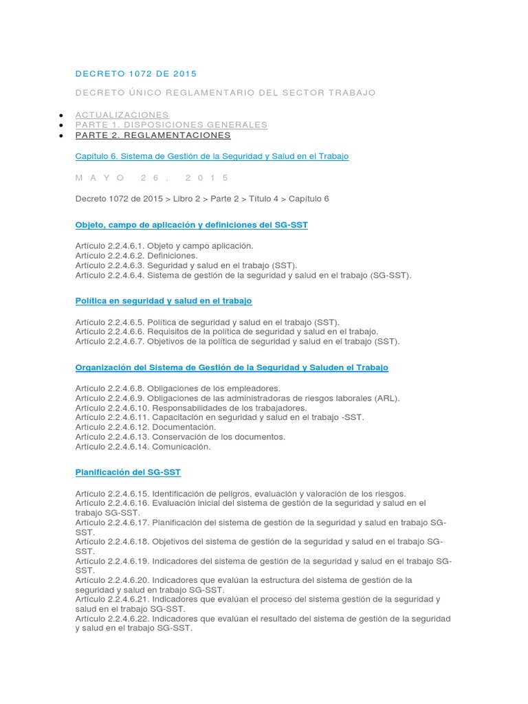 Decreto 1072 de 2015 libro 2, parte 2, tأچtulo 4, capأچtulo. El presente decreto tiene por objeto definir las directrices de obligatorio cumplimiento para implementar el sistema de gestión de la seguridad y salud en el 2. Por medio del cual se expide el decreto único reglamentario del sector trabajo. Por medio del cual se expide el decreto único reglamentario del sector trabajo. (26 de mayo de 2015).